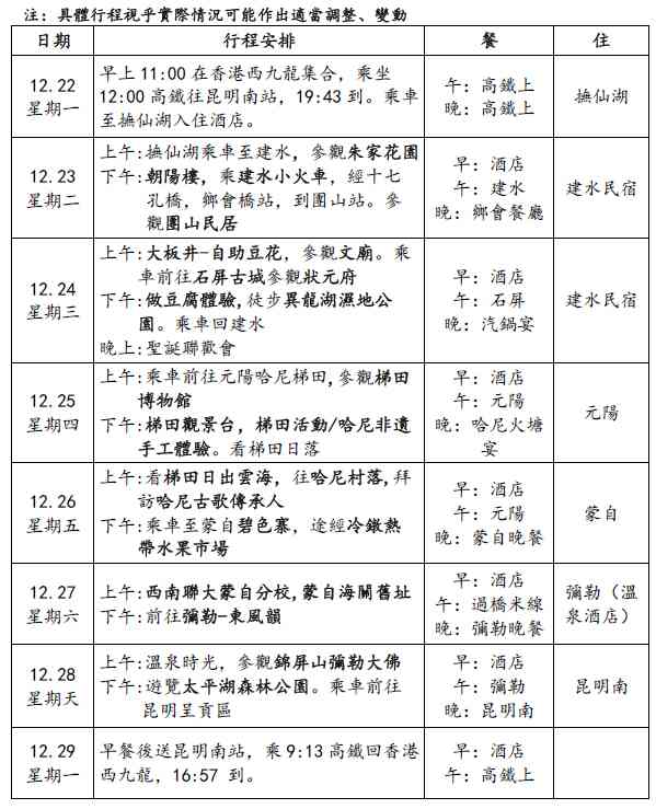 - 本活動採用為團體交通票,參加者必須跟團往返。本活動行程中所安排之車票、酒店或觀光項目,均屬團體訂位,一經在香港確認及訂購後,不論任何情況下而未能使用者,一概不會獲發還任何款項。