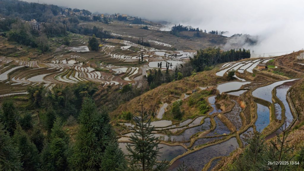 行程重點之一是元陽梯田,觀賞秋收後梯田灌水日照金光鏡面,可惜天公不做美,兩天內都是大霧迷茫看不見日光,為行程留點遺憾。在離開景區時,太陽伯伯可能見我們那麼有誠意,露了幾分鐘的臉,讓我們喵了幾眼梯田,看看那麼壯觀,以後一定要再來呀!